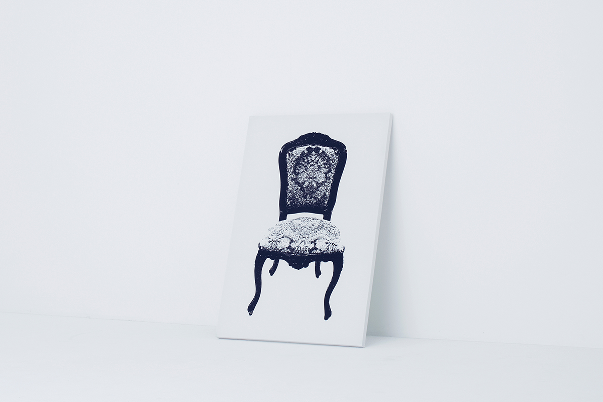 イスの絵が描かれたキャンバス型のイス。壁に立てかけて座ることができる。キャンバス地とイスの絵がプリントされた伸縮性の高い布で木とアルミでできたフレームを覆っている。スツール、アームチェア、ソファの3種類を制作。