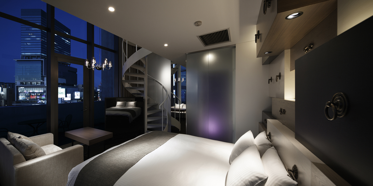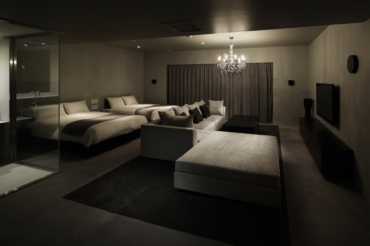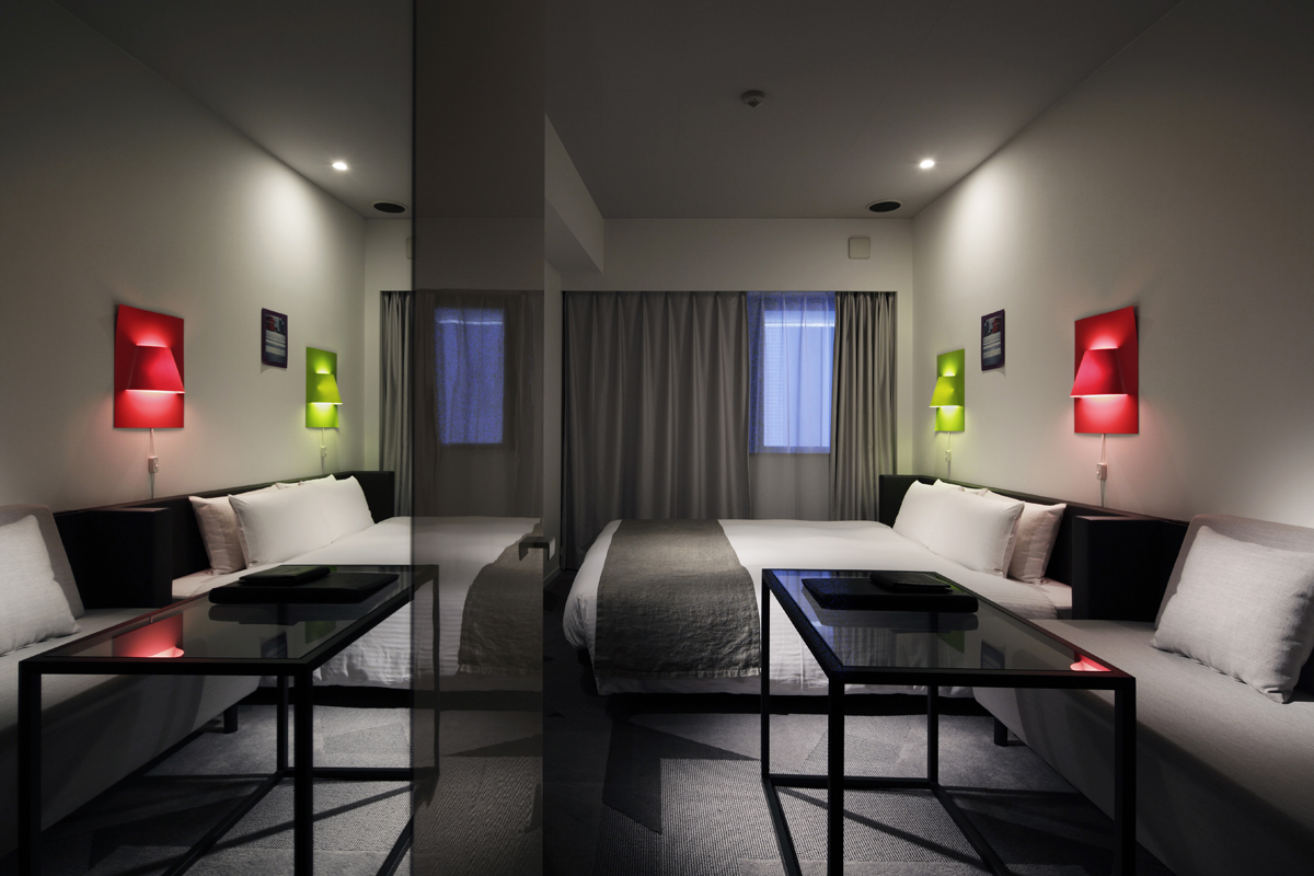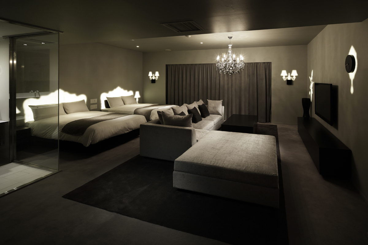 The largest suit room in this hotel. At a glance, it is just a monotone and simple room but once the lighting is turned on, light decoration will emerge on the wall like a magic according to the furniture or products such as a bed, a vase, a clock, etc. by the lighting set in the wall.