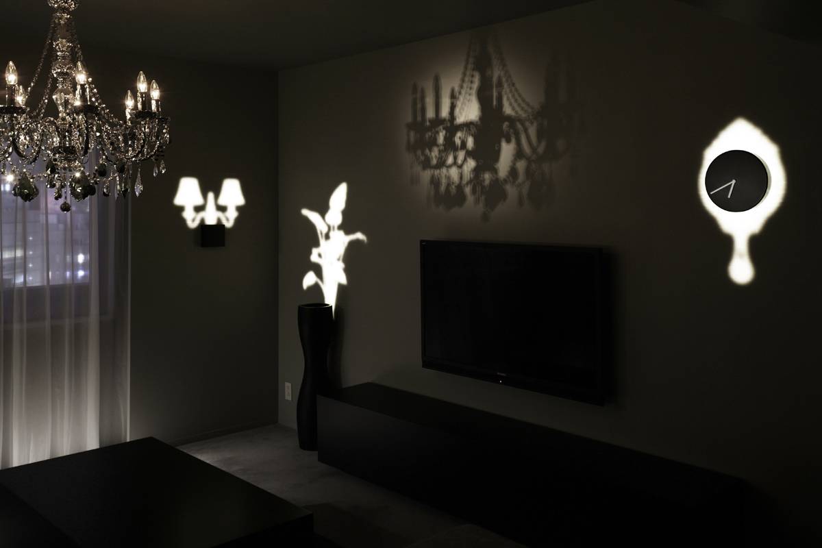 このホテルで一番広いスイートルーム。一見、モノトーンのシックな部屋だが、ひとたび照明のスイッチを入れると、壁の中に埋め込んだ照明により、ベッドや花器、時計などの家具やプロダクトと呼応するように、光の装飾が幻想的に浮かび上がる。