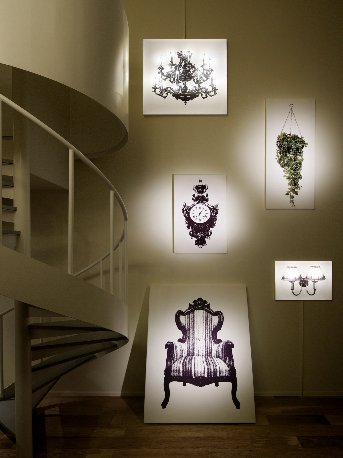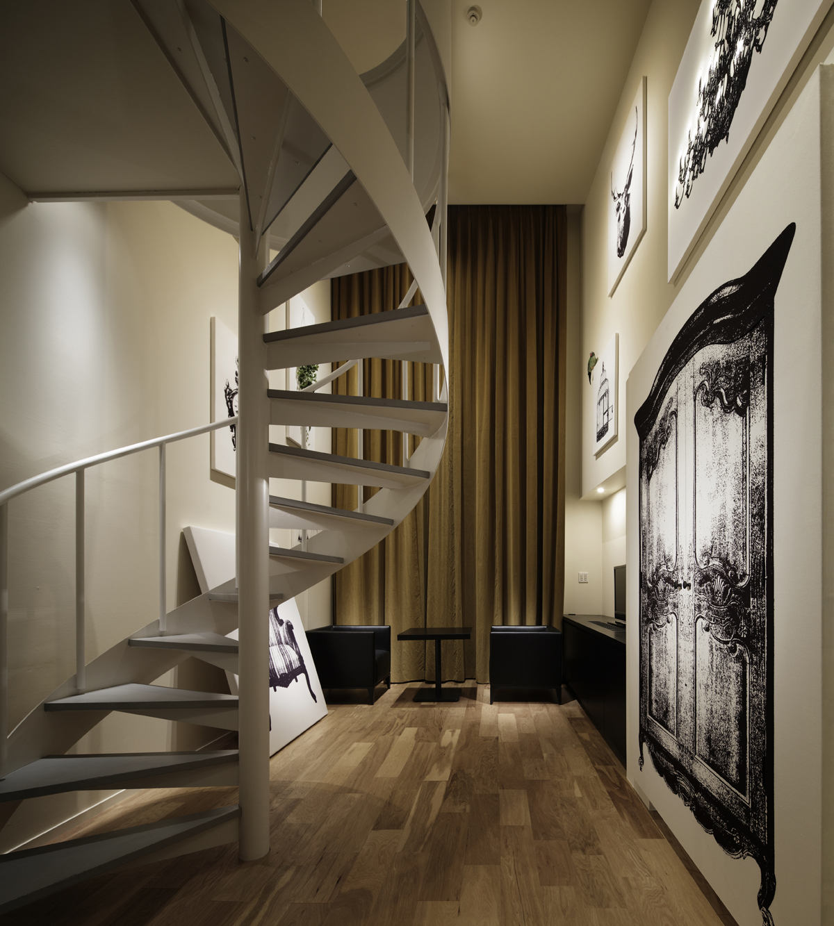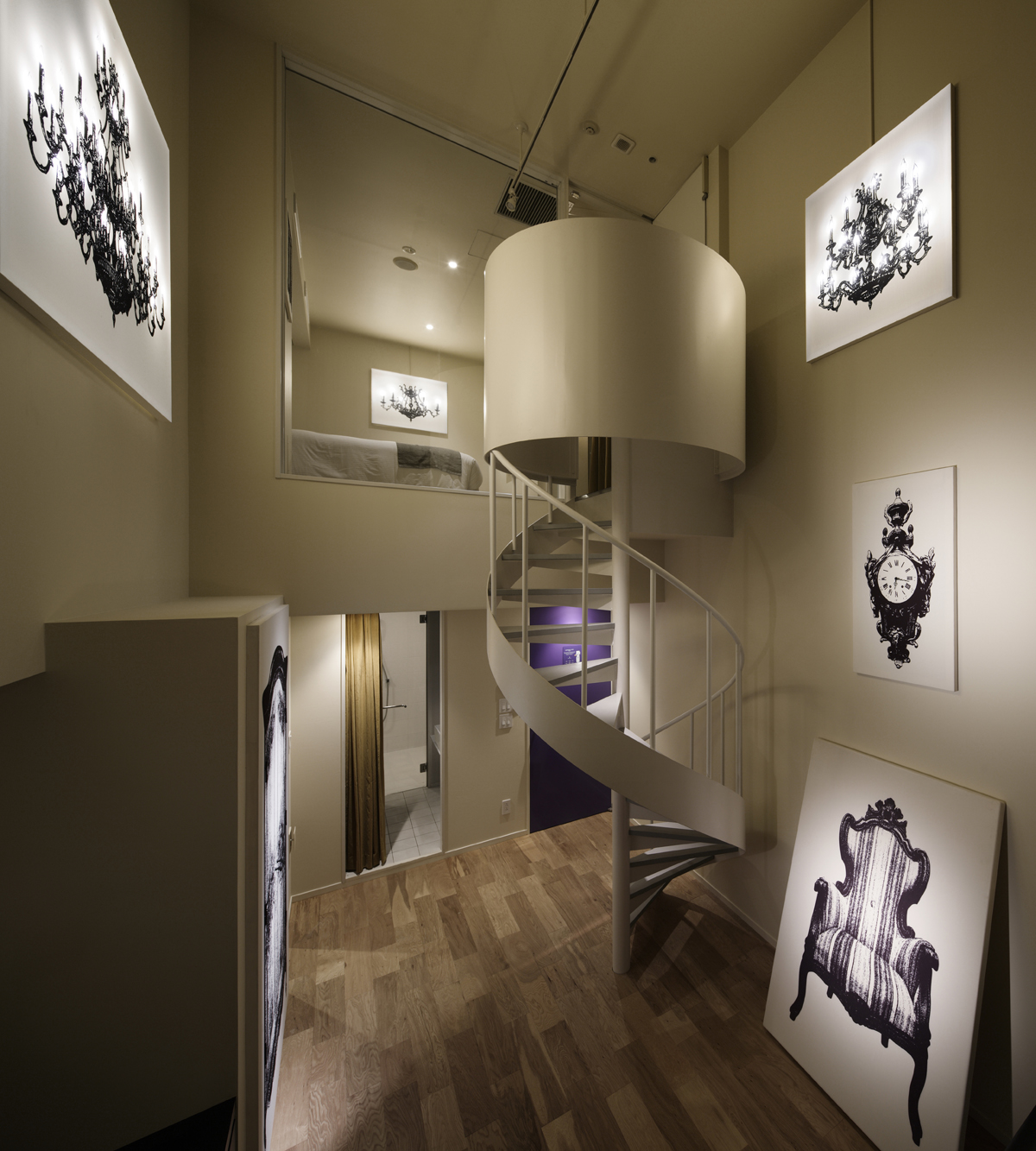 高い天井が特徴的なメゾネットタイプのスイートルーム。壁面全体に、椅子や照明、クローゼット、時計など様々な家具やプロダクトが描かれたキャンバスをレイアウト。すべてのキャンバスが、実際の家具やプロダクトとして機能している。