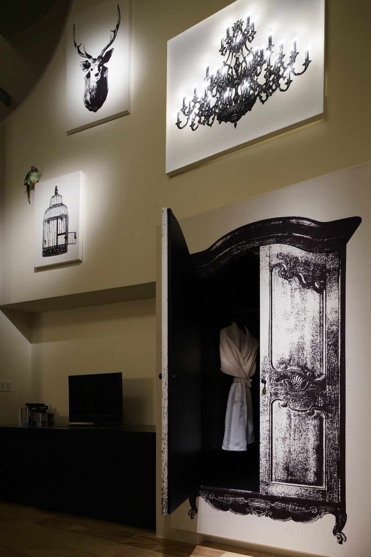 A maisonette suit room with a high ceiling. We put numbers of canvas frames with various drawings such as a chair, a lamp, a closet, a clock, etc. onto the whole wall. Every canvas frame has a function according to the drawing.