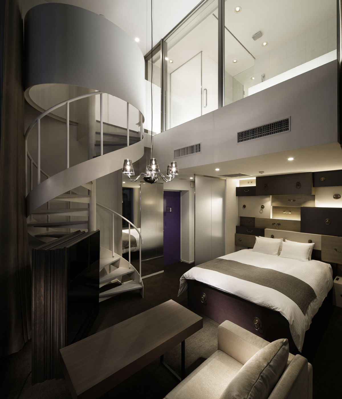 大きな窓ののあるメゾネットタイプのスイートルーム。壁面全体を多数の引き出しで覆い尽くし、間接照明、ベッド、棚など様々な機能を持たせている。