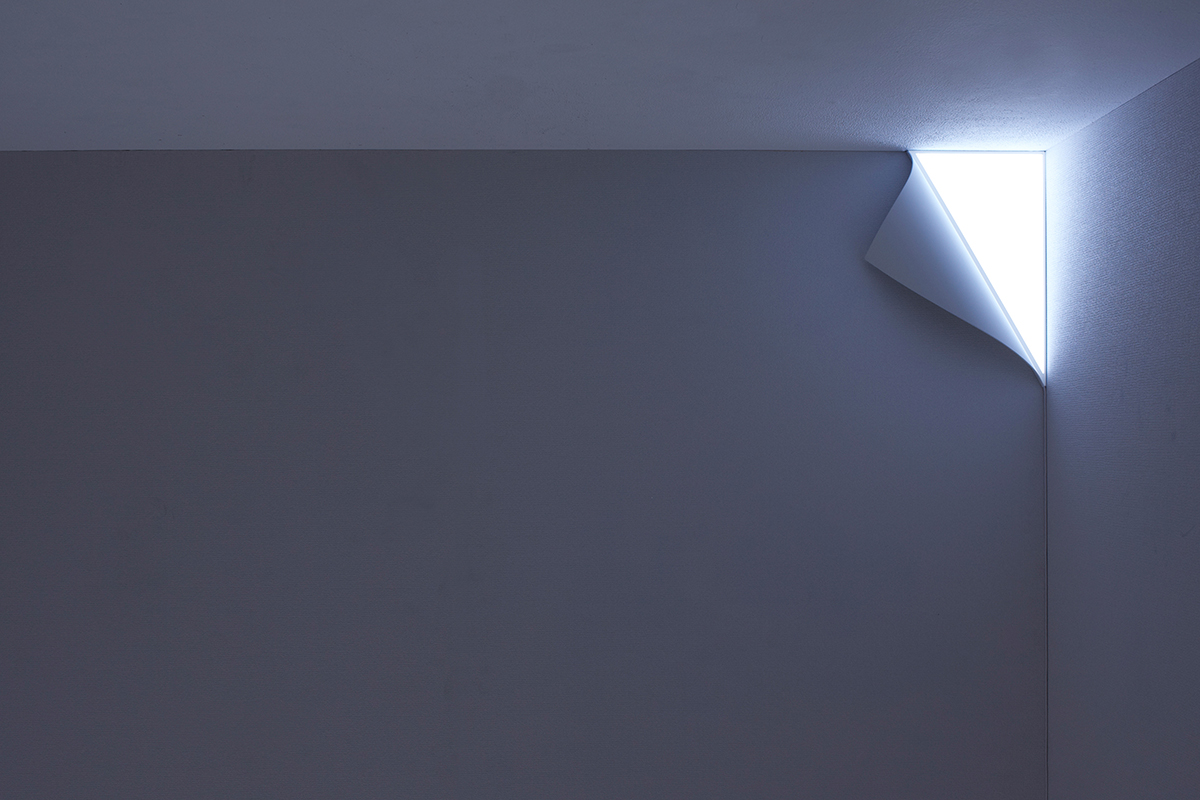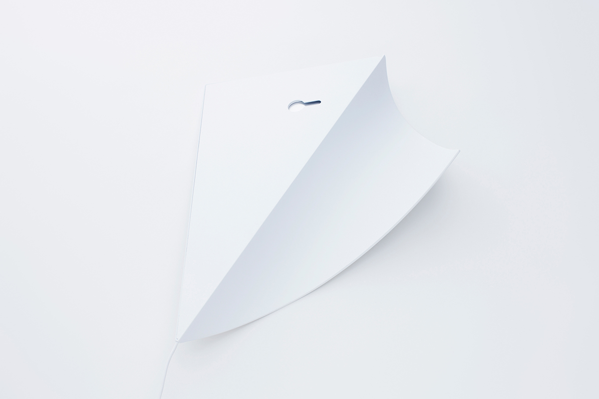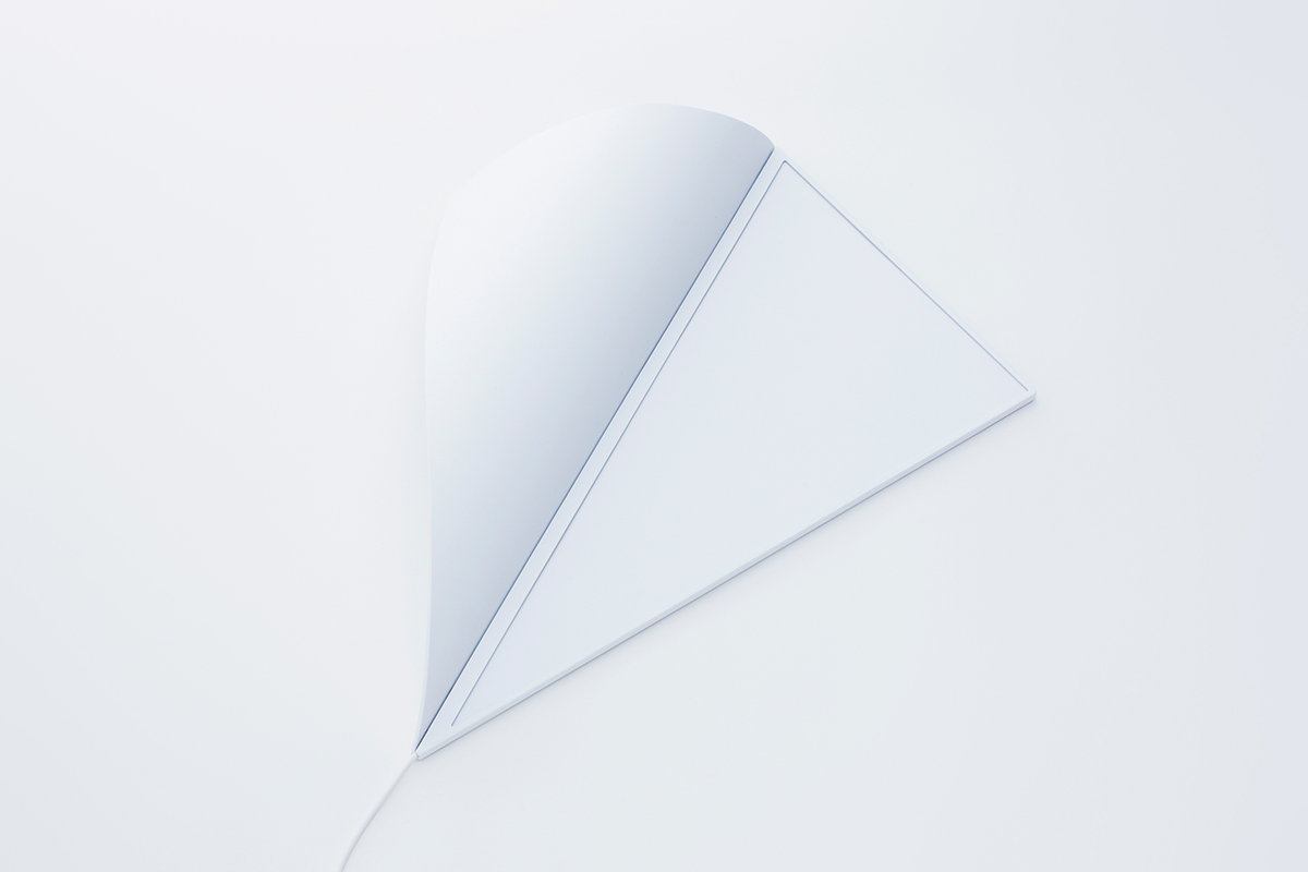 壁の端がめくれ、奥から光が差し込む。そんな風景を生み出す照明。ふたつの直角三角形を長辺で合わせた形状で、壁の端に設置することで壁全体を照明装置に変えることができる。薄い三角形の面光源は、LEDと拡散版によって構成。裏側の穴にフックを引っ掛けて壁に設置し、電源コードは壁の隅に沿わせることで目立たなくした。