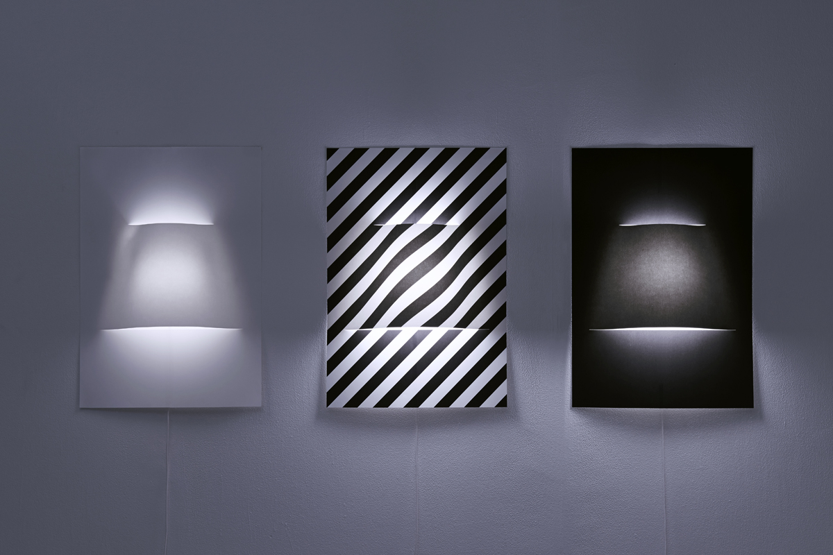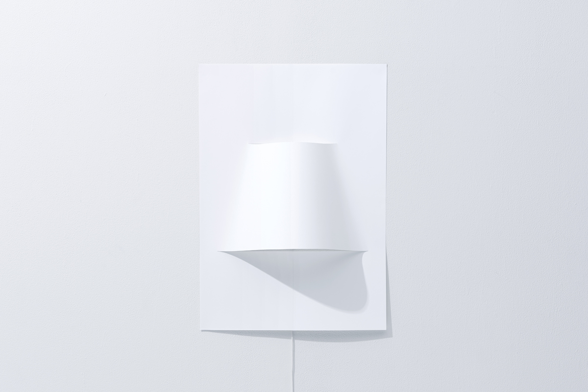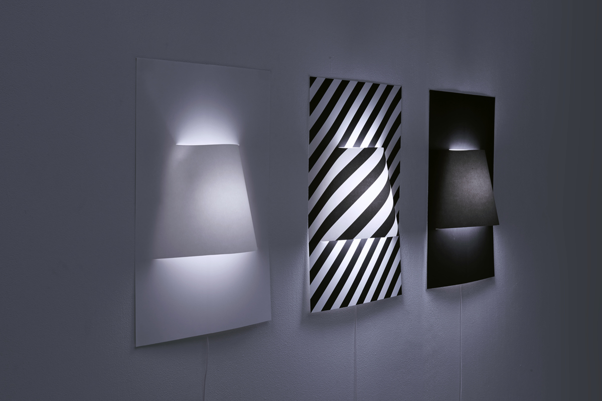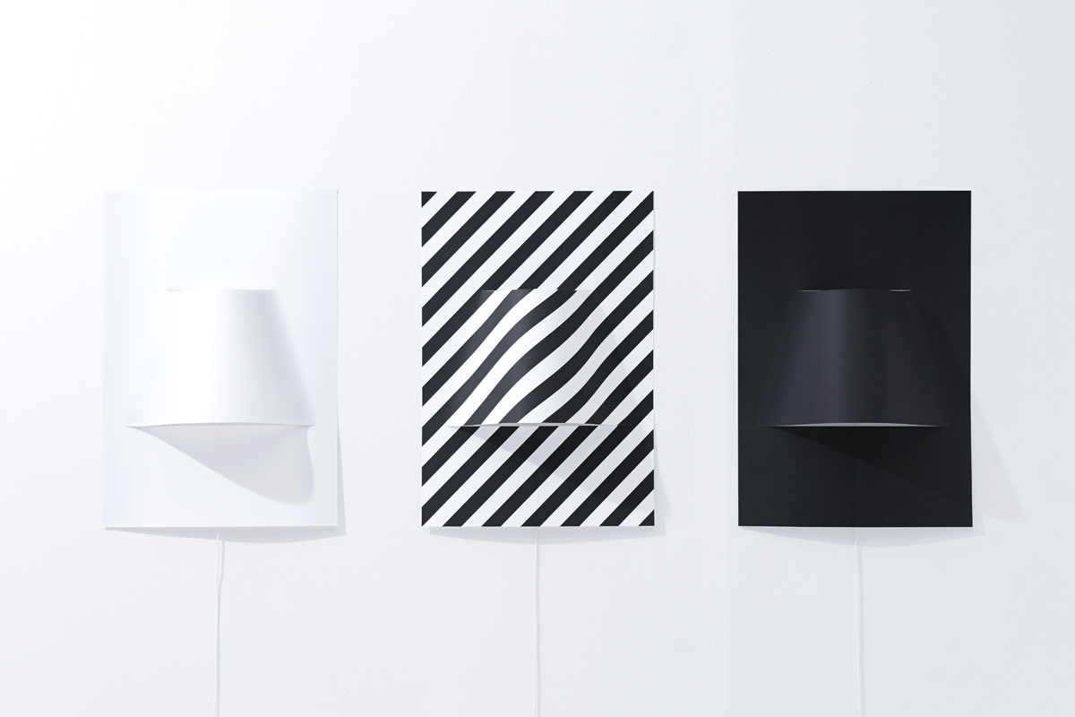 A2サイズのポスターのような壁付け照明シリーズ。一枚の紙からできており、中央にランプシェードのふくらみがある。ポスターと同じように、テープやピンで壁面に簡単に取り付けられ、様々な柄を印刷することができる。