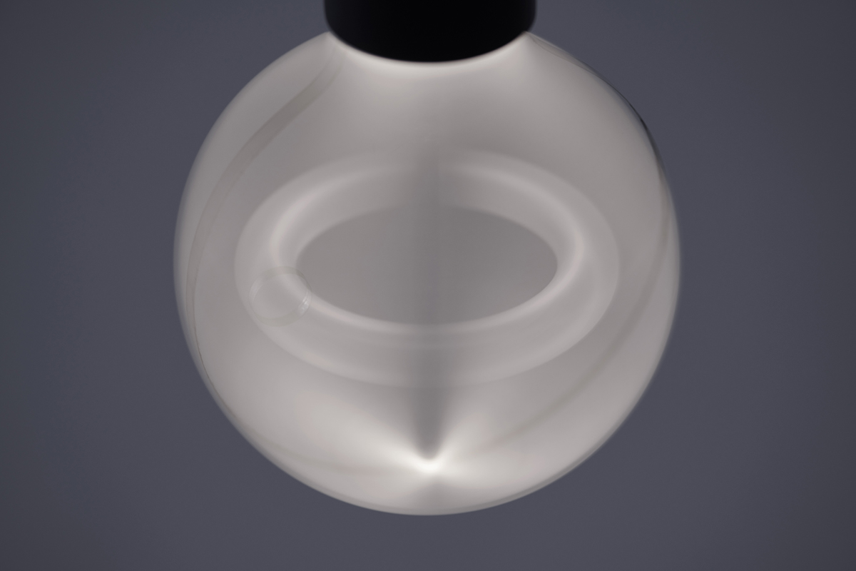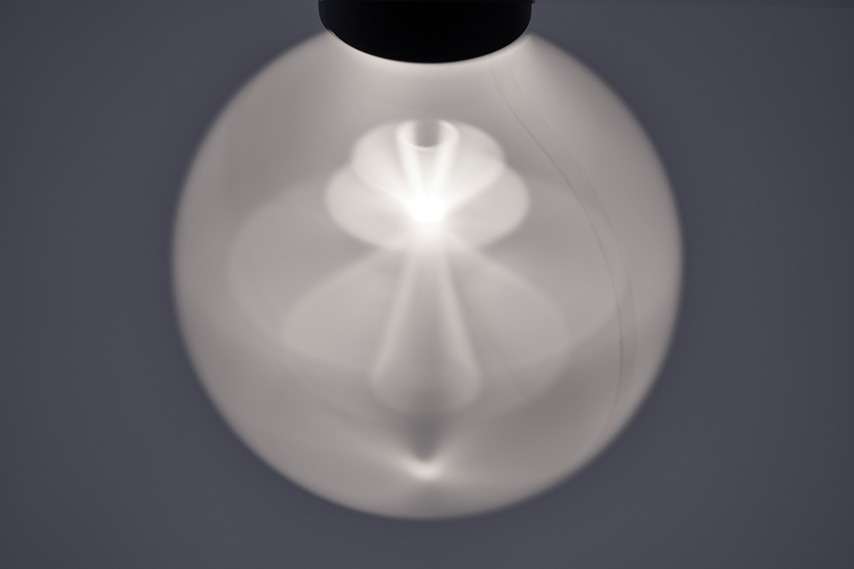 • 模様が入ったアクリル版が回転することで立体的な図像が浮かび上がるペンダント照明。ソケット部にモーターを配しており、アクリル板の中に施す模様によって様々な図像を生み出すことができる。この作品は、商空間の設計施工を行う丹青社のプロジェクトの一貫で制作された。