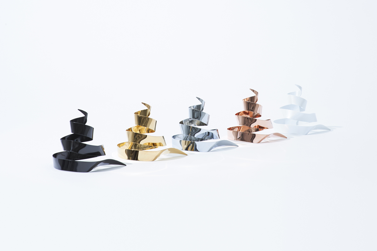 広告会社のクリエイティブアワードのトロフィー。クリエイターたちが「称賛と嫉妬」を込めて思わず「Shit!」とさけんでしまうような素晴らしい作品に贈られる。ふわりと浮かび上がるリボンをモチーフに、最高に美しい「Shit」像を目指した。ステンレスの帯を職人がひとつひとつ高い精度で曲げて製造。