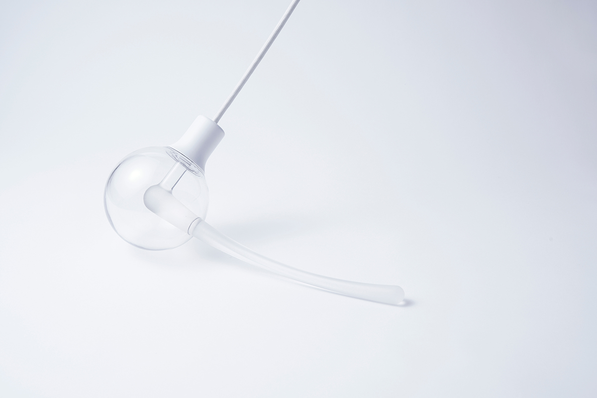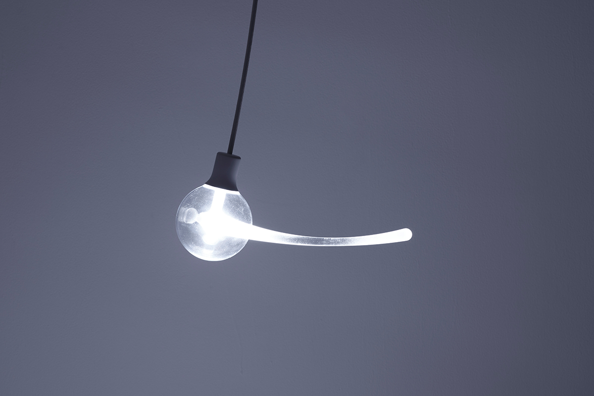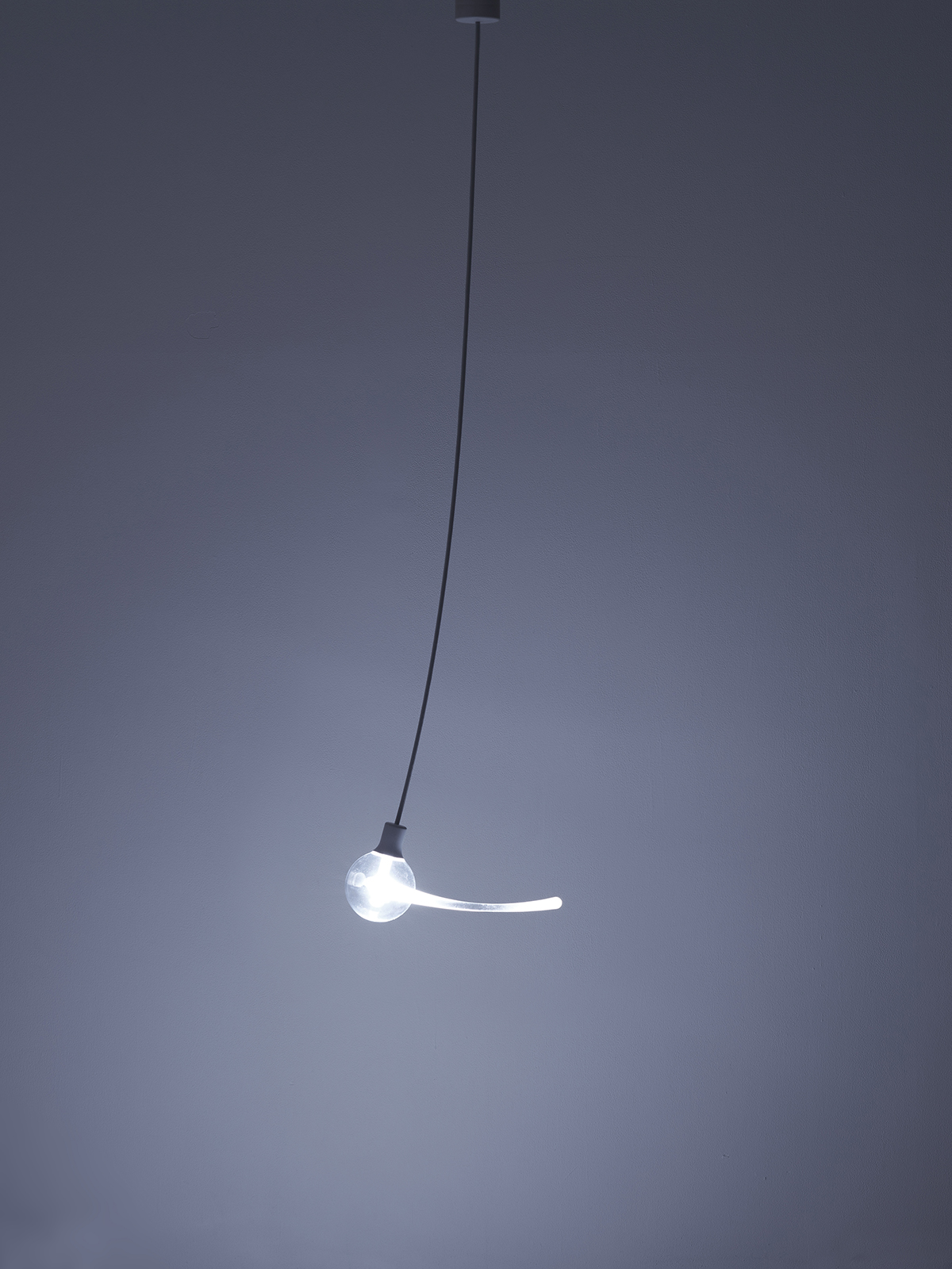 揺れているように見えるペンダントライト。視点を変えると、時間が止まっているようにも感じる。光源にLEDを使い、アクリルによる光ファイバーのしくみで光の軌跡を表現した。