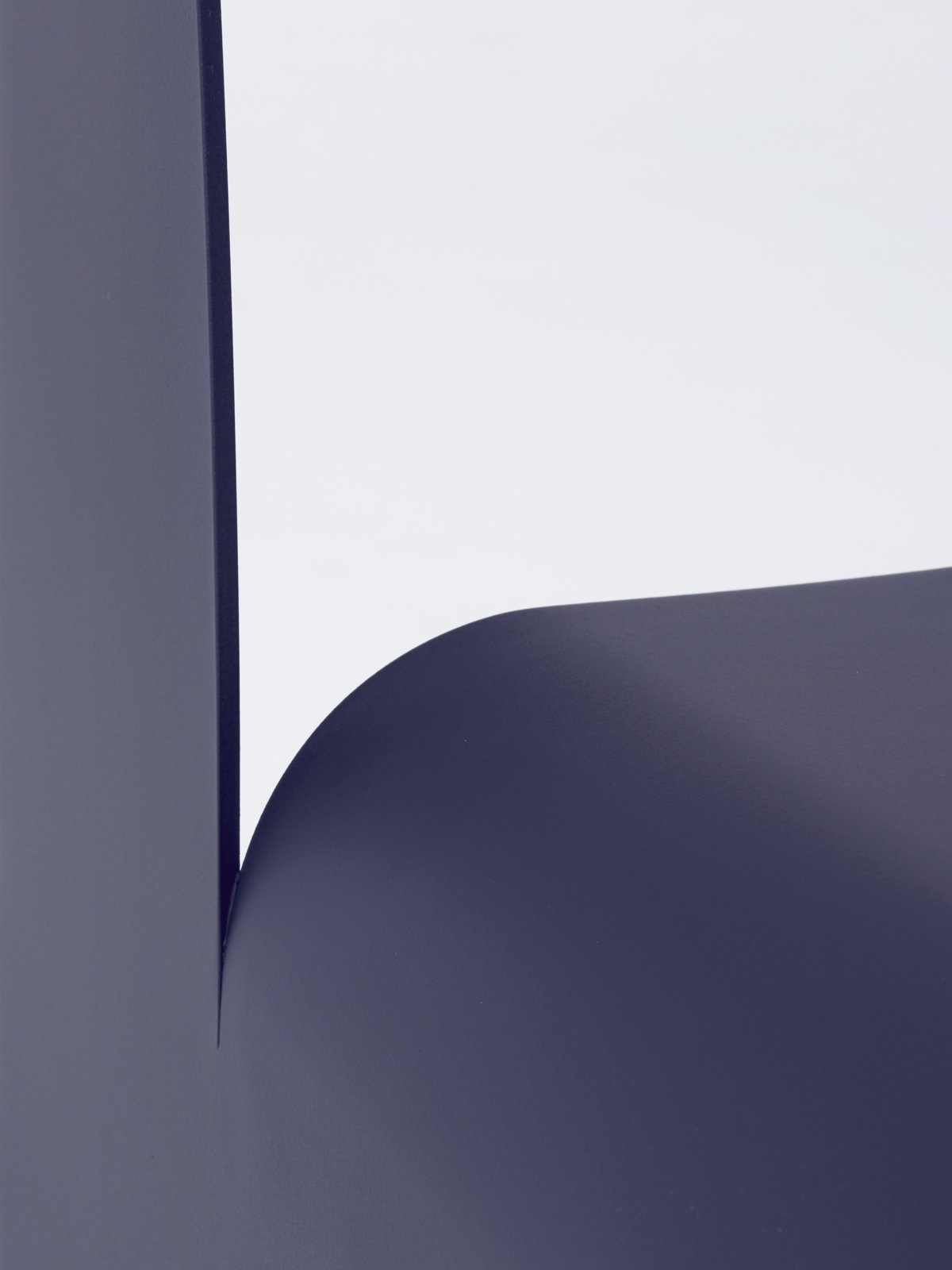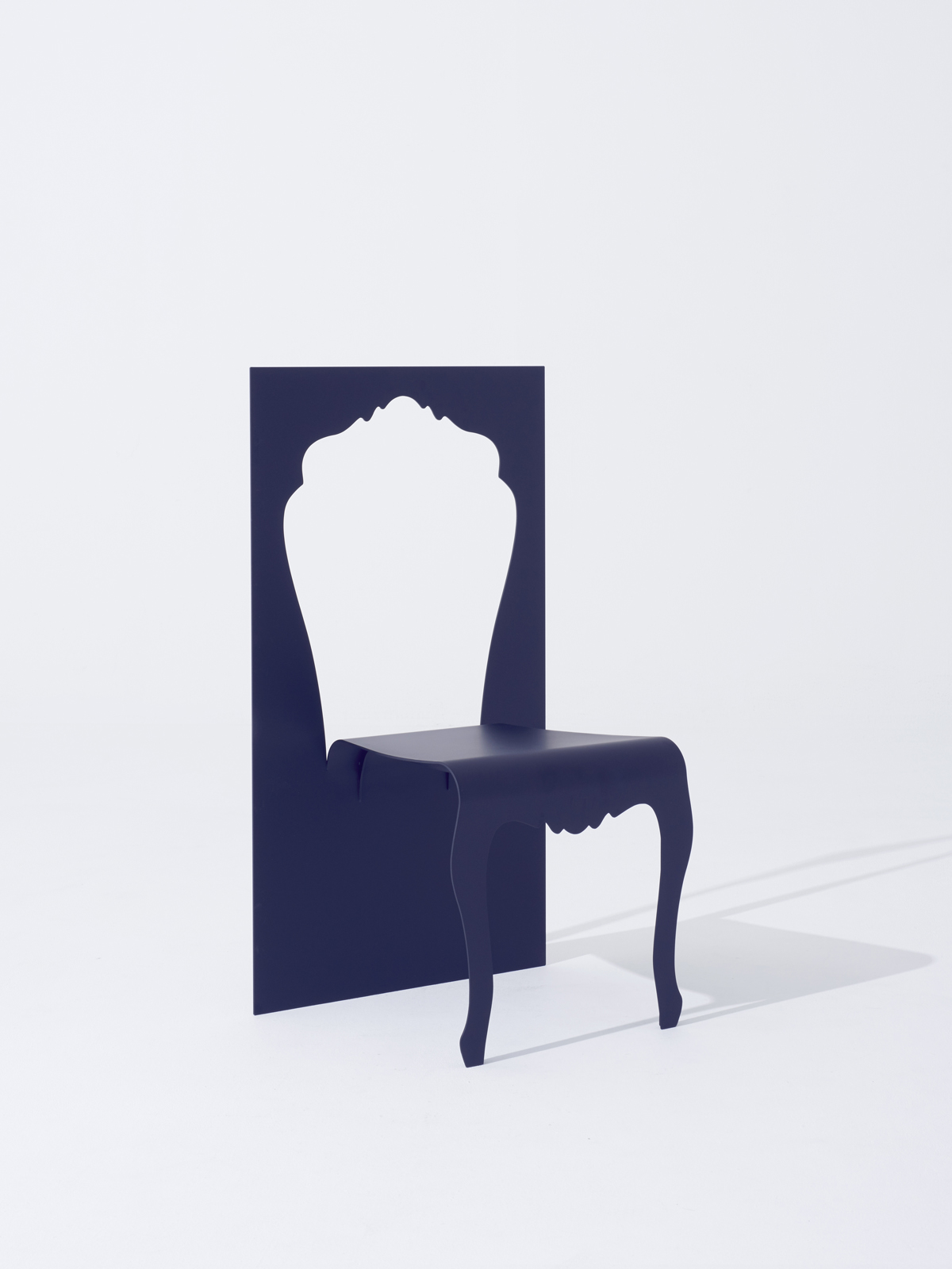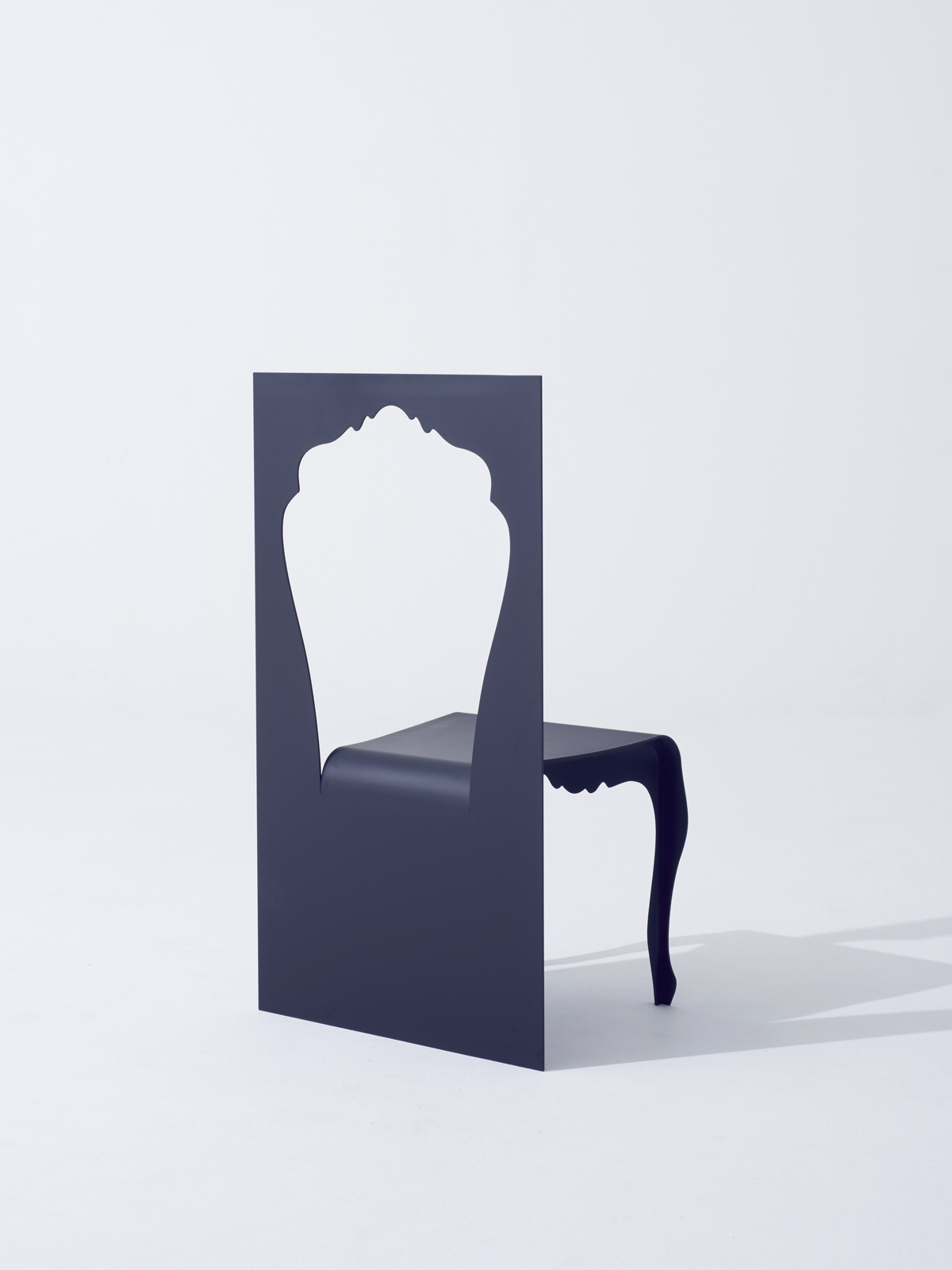一枚の薄い板を切り抜いてつくられたような椅子。切り抜かれた背もたれの形状が座面と脚に変化しているかのように表現。空洞の背もたれの上部は、実際の背もたれとして機能する。