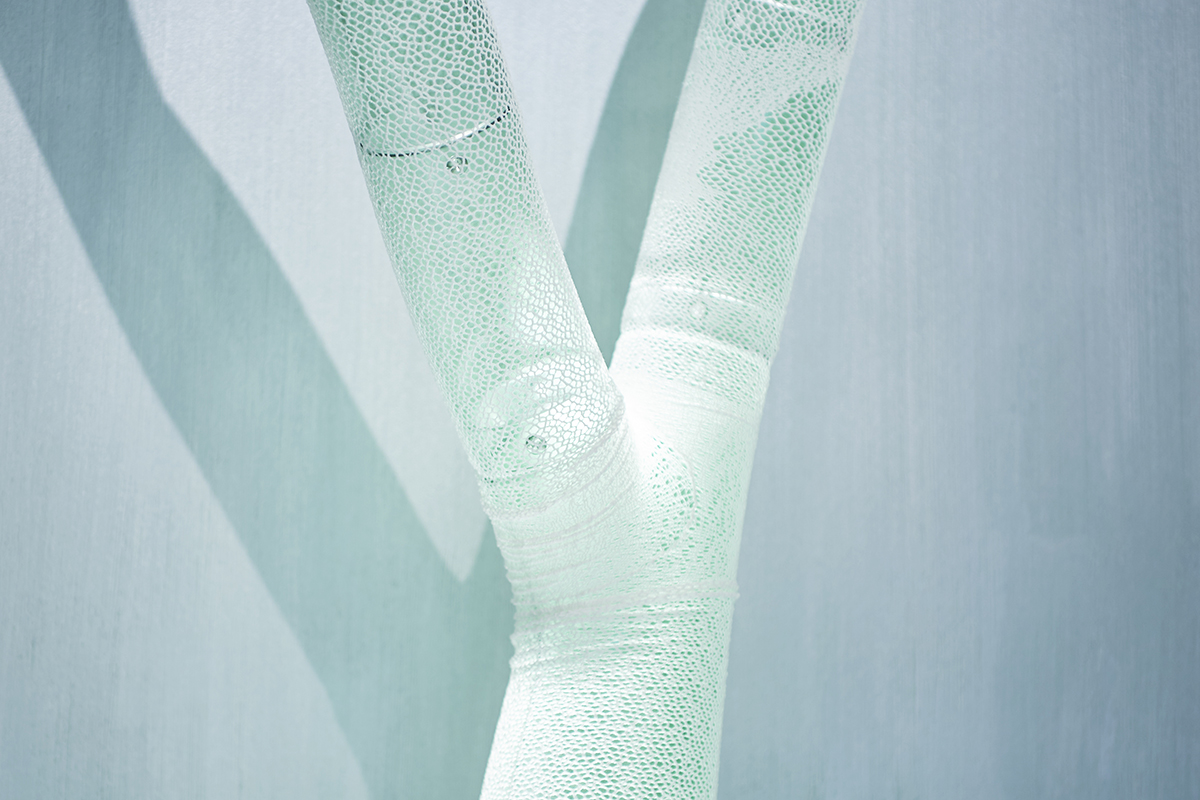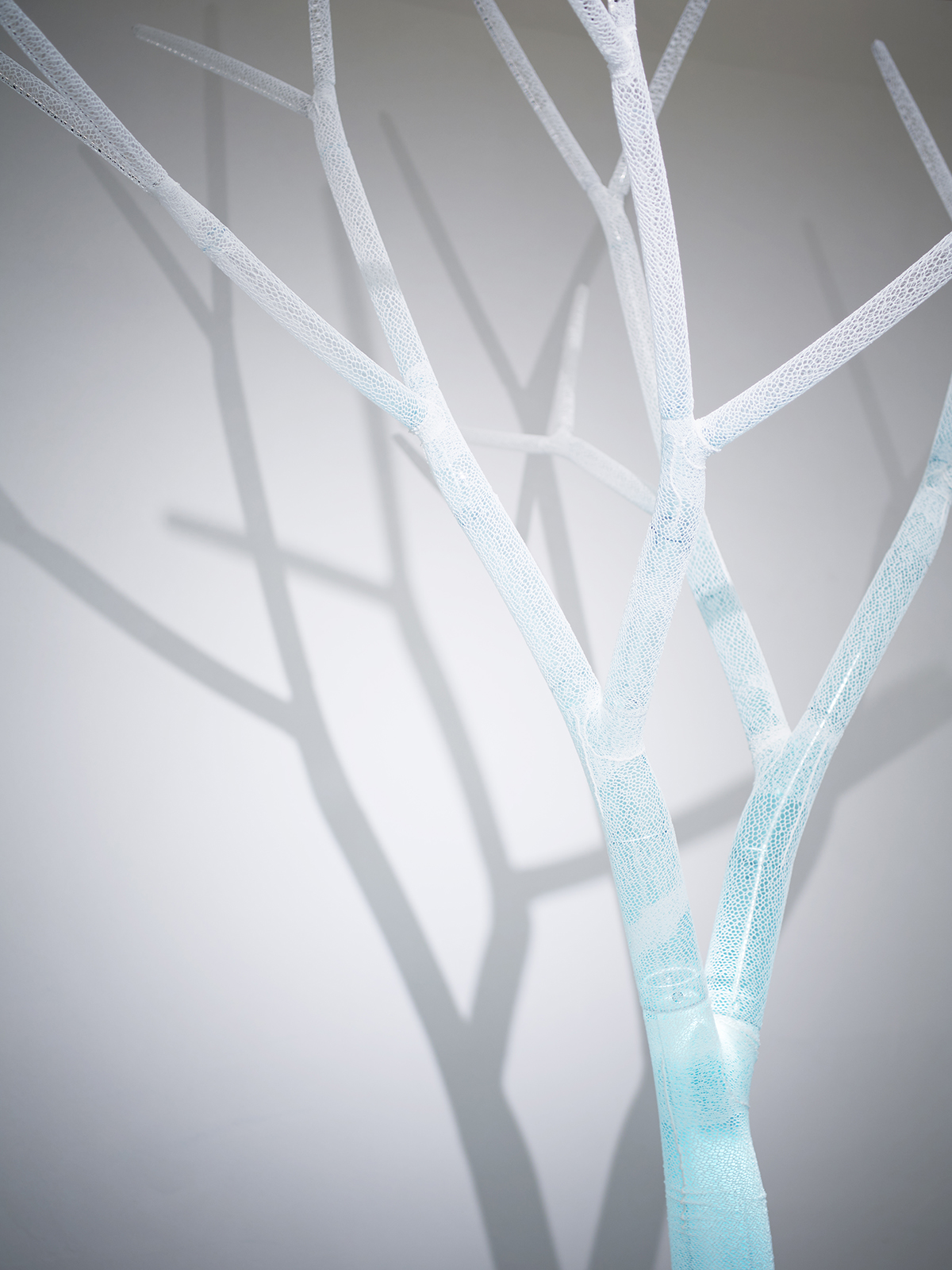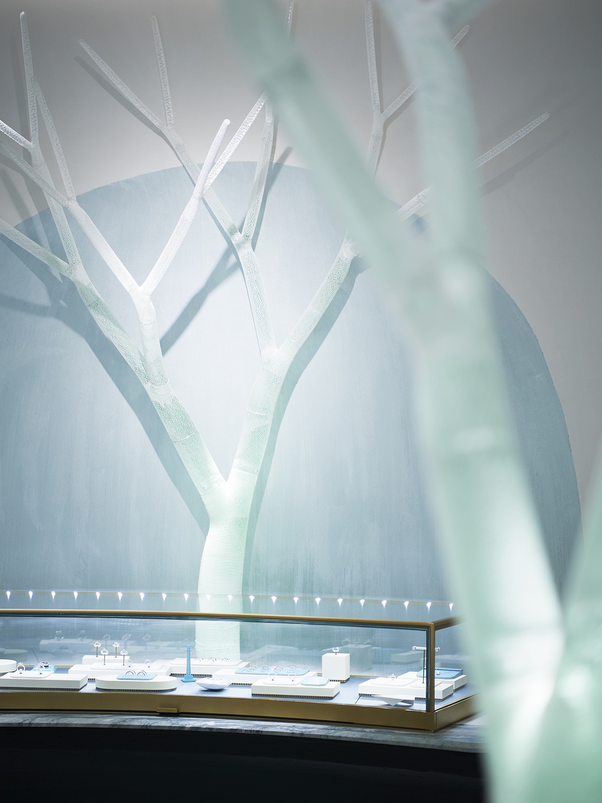 ウェディングドレスから着想したレースの木のオブジェ。フランスのジュエリーブランドBoucheronの銀座本店ブライダルフロアのために制作。それぞれの木は、透明アクリルの真空成形とパイプの曲げ加工を組み合わせた9種46個のパーツで構成され、樹皮の模様を施した伸縮性のある白いレースで覆われている。壁沿いの木には、筒型のスピーカーや照明が吊り下がっており、オランダのインタラクティブデザインスタジオRandom Studioが制作した音と光の演出が体験できる。