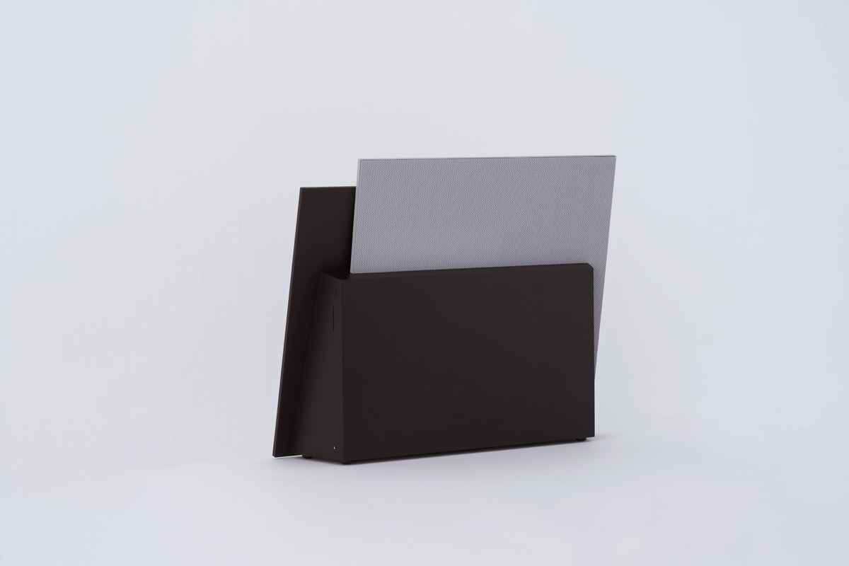 Lyric Speakerは、音楽と同期して歌詞が表示される次世代型スピーカー。モバイル端末から好きな音楽を選曲して再生すると、その楽曲の歌詞が透過スクリーンに浮かび上がる。今回、YOYはLyric Speakerの兄弟モデルをデザイン。一見するとレコードジャケットのように壁に立て掛けられた二枚の板。 ひとつは歌詞を映し出すスクリーン、もうひとつの背面にはスピーカーが隠れている。
