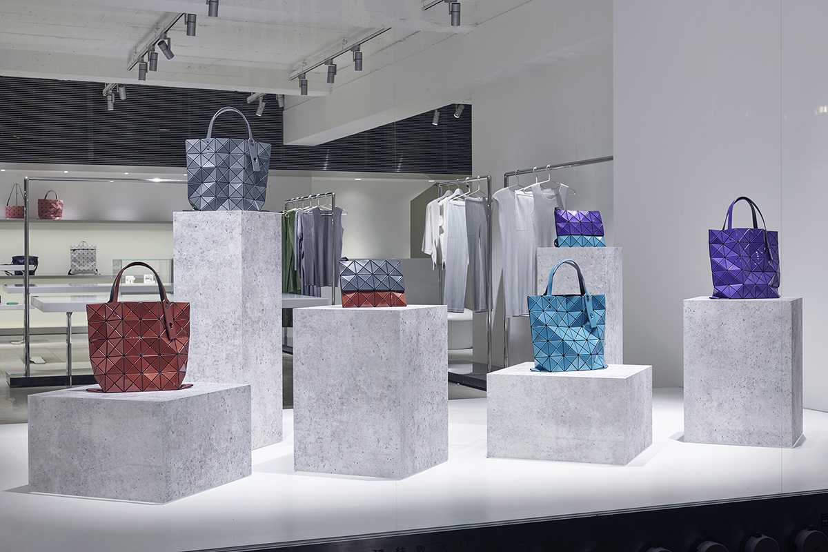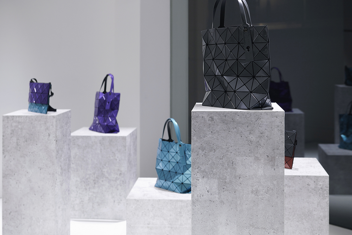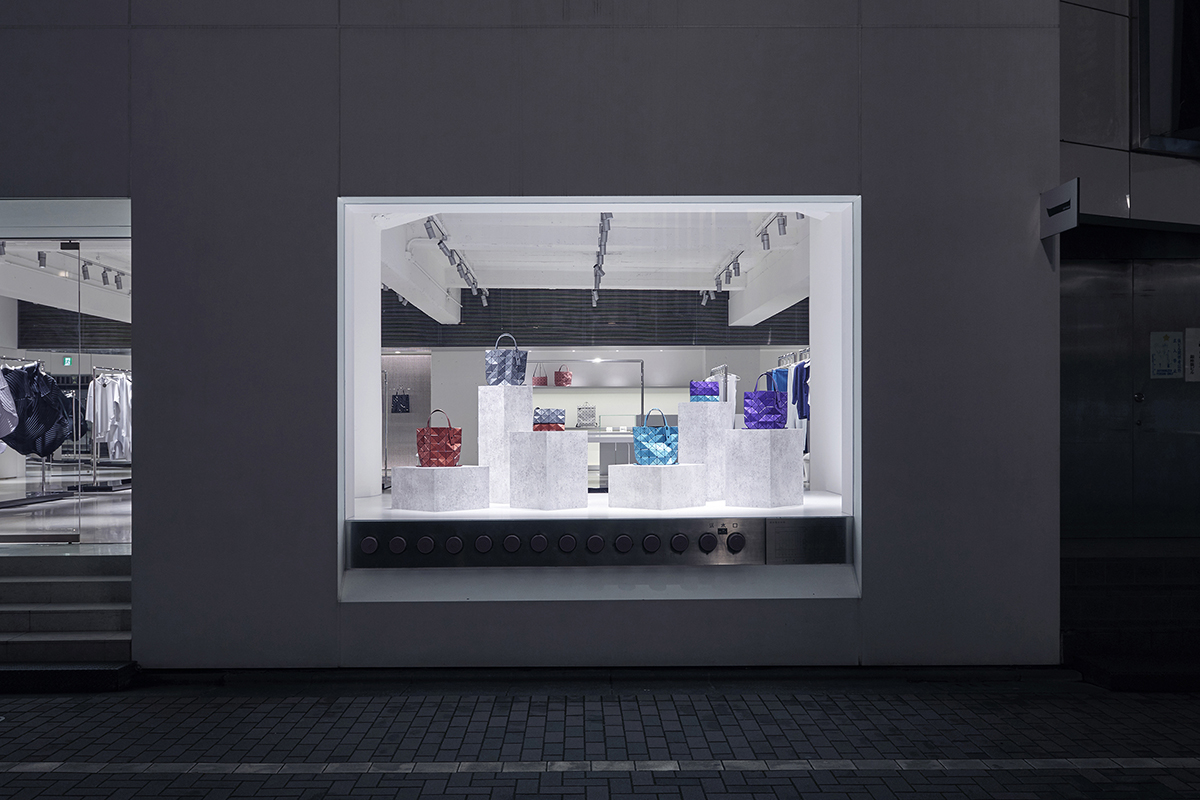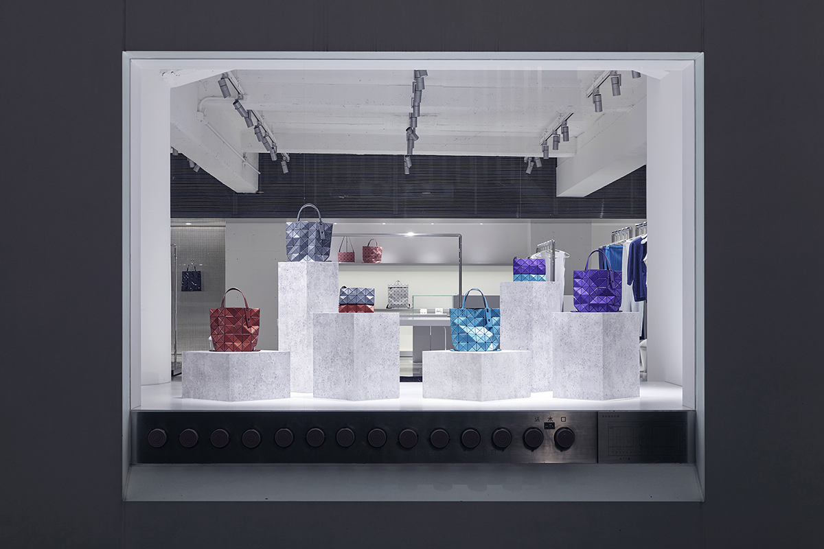 BAO BAO ISSEY MIYAKEのウィンドウディスプレイのために制作した什器。2018年に開催された「Material Design Exhibition」で発表した、見る角度によって透過性が変化する「塊」をモチーフとした箱のシリーズ「MASS」の考え方を応用。コンクリートのテクスチャーを印刷した目の細かなポリエステルメッシュでアクリルボックスを覆っている。メッシュの特性上、斜めから見ると不透明に見え、正面から見ると中が透けて見える効果がある。重く不透明なコンクリートがもつイメージに対して、軽さと透明性という真逆の性質を感じる認知的不協和を実体化した。